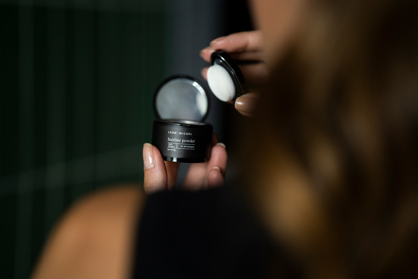 Para un look espeso y natural, ambos productos Leon Miguel pueden combinarse a la perfección. El polvo para el cabello se aplica a lo largo de las zonas apropiadas en las raíces con la ayuda de la esponja integrada para crear líneas de cabello uniformes.